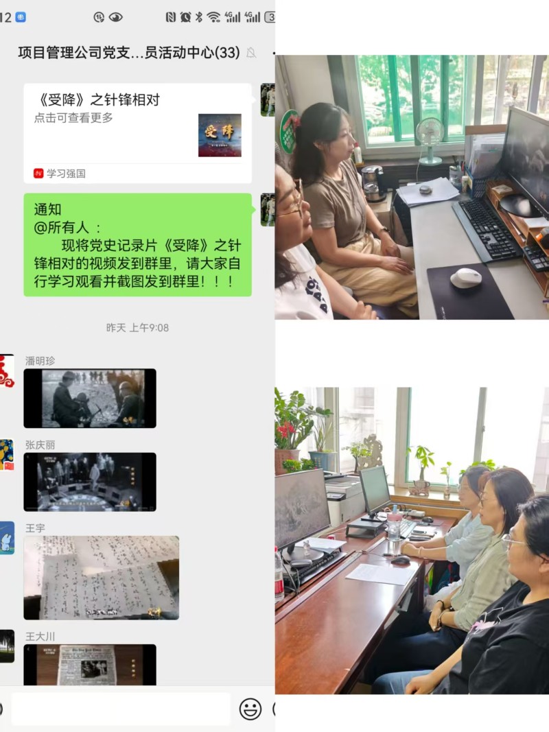 9月1日,項目管理公司黨支部開展“重溫歷史 奮勇爭先”主題活動。活動中,全體黨員干部共同觀看黨史紀錄片《受降》,紀錄片以詳實的史料、珍貴的影像生動展現中國共產黨始終以人民利益為根本,在復雜形勢下堅守信仰、運籌帷幄的政治智慧和使命擔當,引導黨員干部不斷加強黨史學習,切實把優秀歷史經驗轉化為推動工作的實際行動。