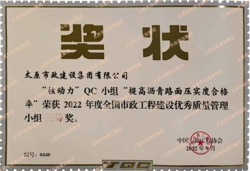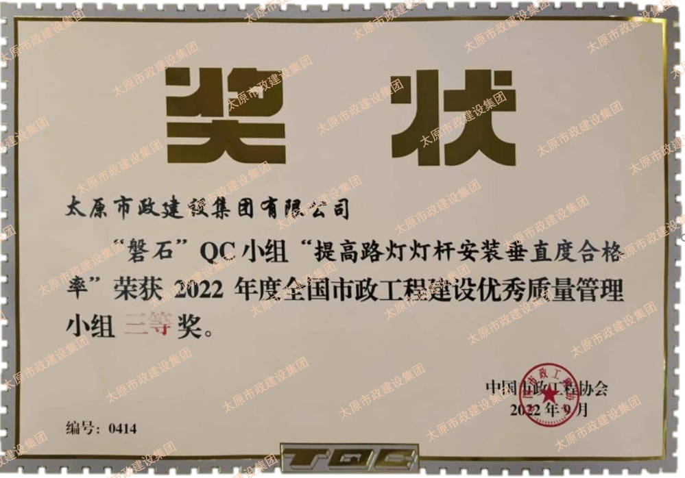 集團公司申報的“磐石”QC小組“提高路燈燈桿安裝垂直度合格率”、“核動力”QC小組“提高瀝青路面壓實度合格率”榮獲2022年度全國市政工程建設優秀質量管理小組三等獎。