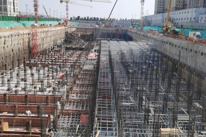 施工中,項目部從制度管控和具體實操入手,早部署、早落實,始終做到“心中有全局,手中有物資”。該工程的施工重點是深基坑大體積施工,如遇強降雨天氣,基坑內積水量大,無法自行排出。項目部根據深基坑施工現狀,為各施工隊伍配備排水泵,確保在24小時內將積水排出基坑外, 并加快深基坑底板混凝土澆筑,盡早硬化底板地面;基坑兩側用沙袋設置阻水帶,提前做好邊坡防護,防止雨水對深基坑造成浸泡侵蝕。同時,項目部安排施工人員加大監測頻率,如果發現數據異常,及時上報并組織專家論證,確保深基坑施工“萬無一失”。