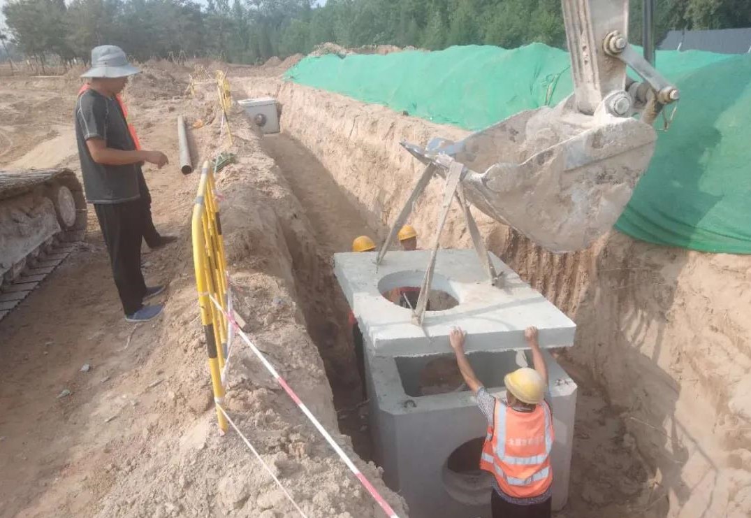 該工程包括道路工程、給排水工程、供熱工程、電氣及弱電工程等,涉及雨水、污水、給水等九種管線施工。施工前,項(xiàng)目部針對(duì)工程管線多,且各類管線的埋深及位置不同,因地制宜、提前規(guī)劃,安排施工人員第一時(shí)間摸清管線施工位置,做好分區(qū)域、分層次施工安排。施工中,項(xiàng)目部針對(duì)工程點(diǎn)多面廣的情況,將整個(gè)工地分為東西兩個(gè)工區(qū),安排四個(gè)施工隊(duì)分別負(fù)責(zé)各類管線施工,交叉利用機(jī)械進(jìn)行倒替作業(yè),為后續(xù)施工贏得更多時(shí)間。同時(shí),由于雙塔景區(qū)項(xiàng)目分九個(gè)標(biāo)段,周邊施工的兄弟單位眾多,管線及道路施工都與園林、古建等施工單位存在交叉施工的情況。項(xiàng)目部“兩手抓、雙推進(jìn)”,一邊組織相關(guān)人員進(jìn)行現(xiàn)場(chǎng)勘察,優(yōu)化施工方案;一邊積極與業(yè)主及周邊施工單位進(jìn)行溝通協(xié)調(diào),合理確定機(jī)械、材料等進(jìn)場(chǎng)時(shí)間,采取錯(cuò)峰施工,最大化減小交叉施工影響,加快推動(dòng)工程進(jìn)展。
