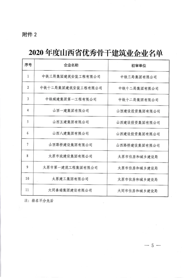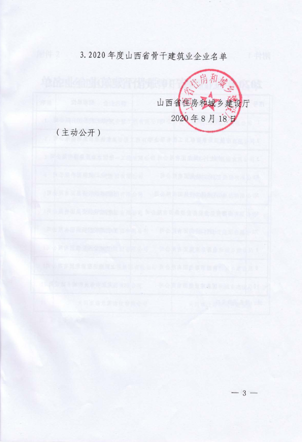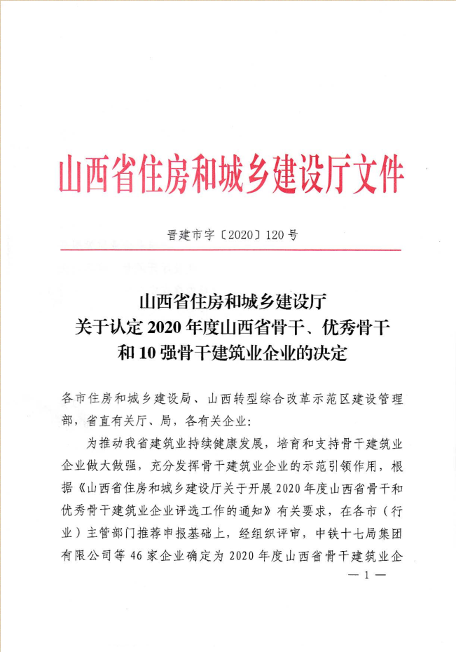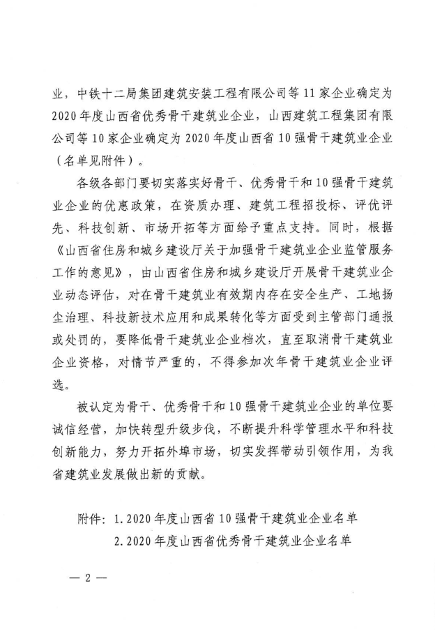 近日,山西省住房和城鄉(xiāng)建設(shè)廳發(fā)布《關(guān)于認定2020年度山西省骨干、優(yōu)秀骨干和10強骨干建筑業(yè)企業(yè)的決定》,集團公司再次被認定為“山西省優(yōu)秀骨干建筑業(yè)企業(yè)”。