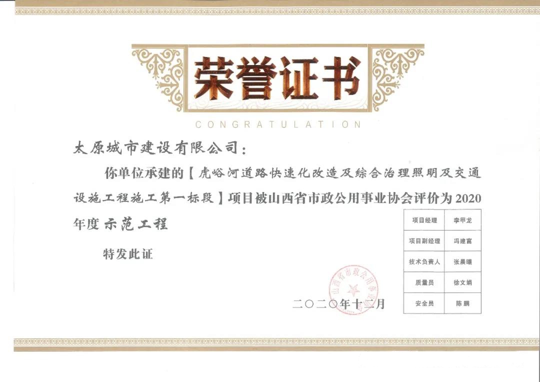 近日,太原城建公司承建的虎峪河道路快速化改造及綜合治理照明及交通設施工程施工一標段被山西省市政公用事業協會評為“2020年度示范工程”。李甲龍在2020年度山西省市政公用事業協會市政工程項目經理評價活動中被評為“優秀項目經理”。