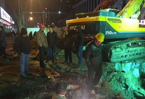 26日晚9點50分,經過百余名搶修人員的共同努力,供水管道搶修順利完成,并對開挖路面進行了回填施工。