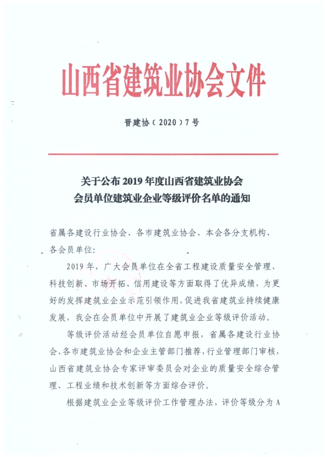 近日,山西省建筑業協會公布2019年度建筑業企業等級評價名單,集團公司被評為2019年度山西省A級(優秀)建筑業企業。
