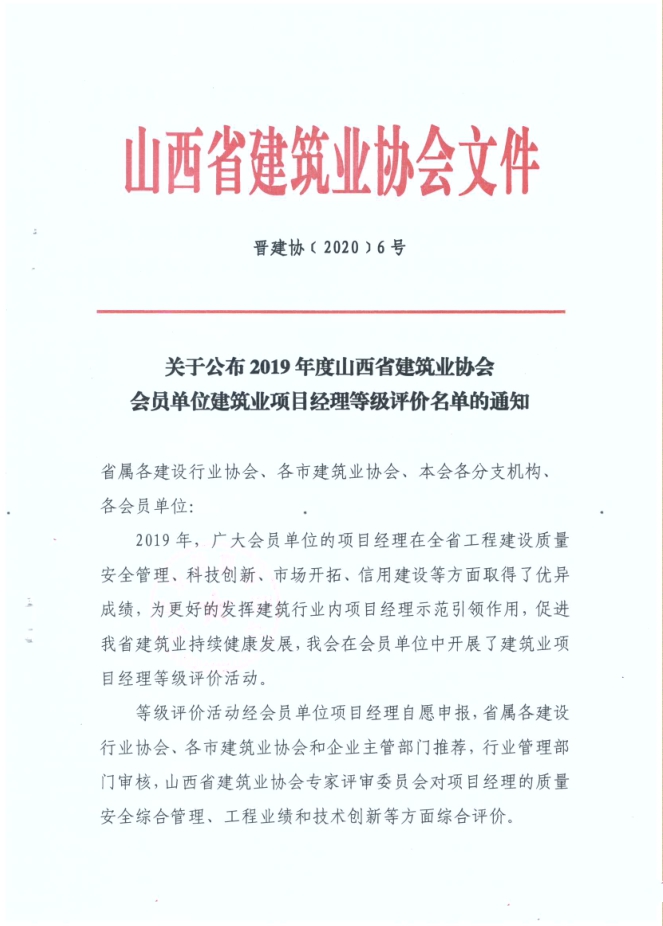 在“2019年度山西省建筑業協會會員單位建筑業項目經理等級評價”評選結果中,集團公司張晉虎、趙淑鳳、崔澤英、楊娟被評為2019年度山西省建筑業A級(優秀)項目經理。