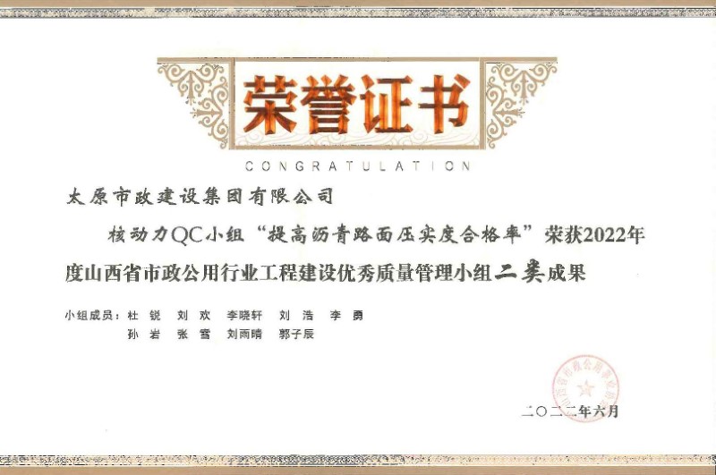 2022年度山西省市政公用行業工程建設優秀質量管理小組二類成果_核動力QC小組“提高瀝青路面壓實度合格率”