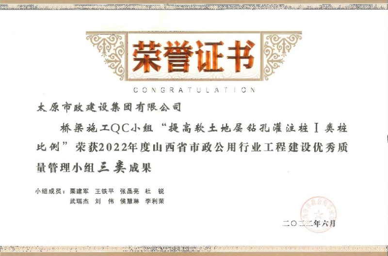 2022年度山西省市政公用行業工程建設優秀質量管理小組三類成果_橋梁施工QC小組“提高軟土地層鉆孔灌注樁I類樁比例”
