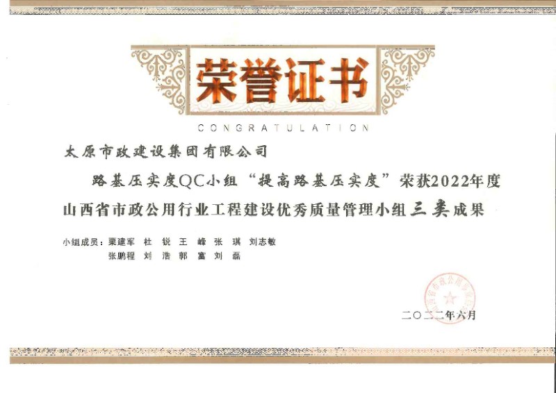 2022年度山西省市政公用行業工程建設優秀質量管理小組三類成果_路基壓實度QC小組“提高路基壓實度”