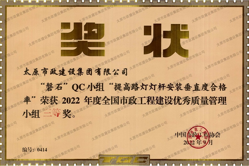 2022年度全國市政工程建設優秀質量管理小組三等獎_”磐石“QC 小組“提高路燈燈桿安裝垂直度合格率”